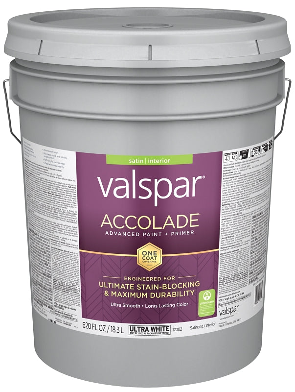 Valspar Accolade 1200 028.0012002.008 Latex Paint, Acrylic Base, Satin, Ultra White, 5 gal, Plastic Pail